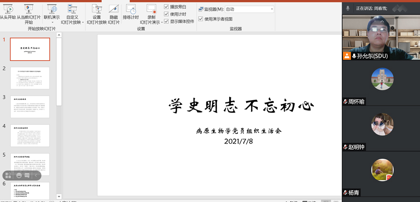 7月8日,病原生物学党支部召开“学史明志,不忘初心”组织生活会,会议由党支部书记孙允东主持,党支部全体师生党员参加了会议。