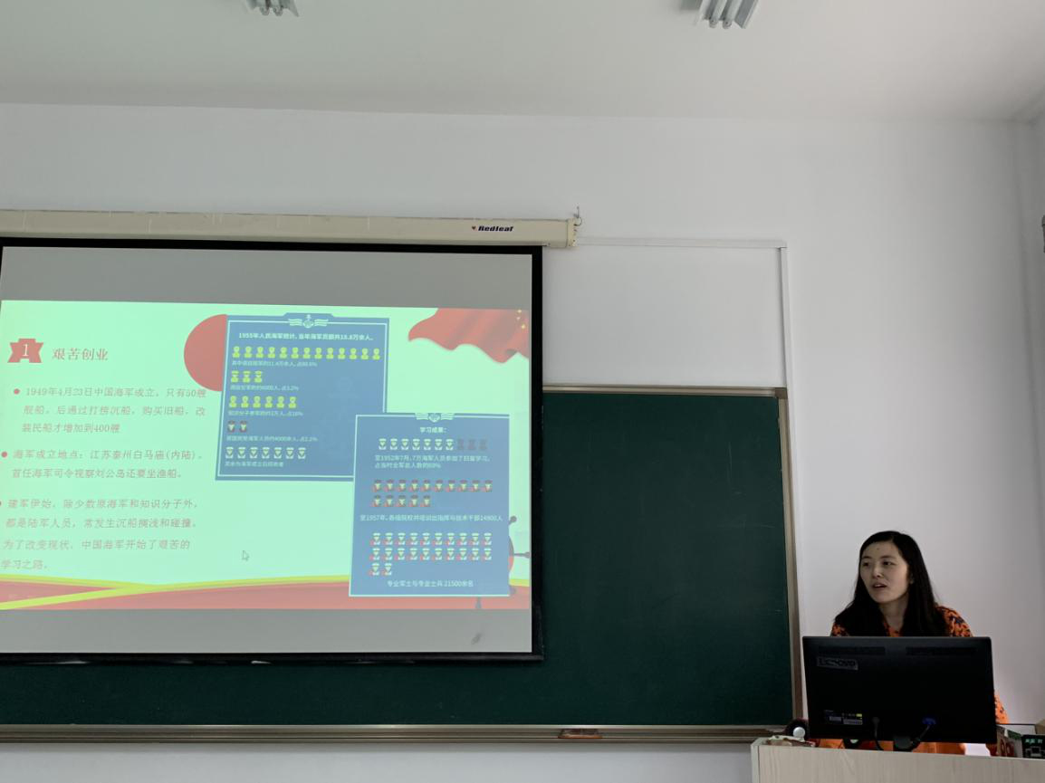 党支部青年委员2017级博士研究生赵姗姗同学以庆祝“中国人民海军建军70周年”作为“微党课”主题进行了讲解。赵姗姗以图片的形式向大家介绍了中国海军发展史,讲述了中国海军从解放战争后期建立,到重铸海上长城,捍卫中华海权的过程。接下来,带领大家学习了习近平总书记出席庆祝人民海军成立70周年海上阅兵活动时发表的重要讲话精神。最后,大家一起观看了“人民海军,和平力量”宣传片。