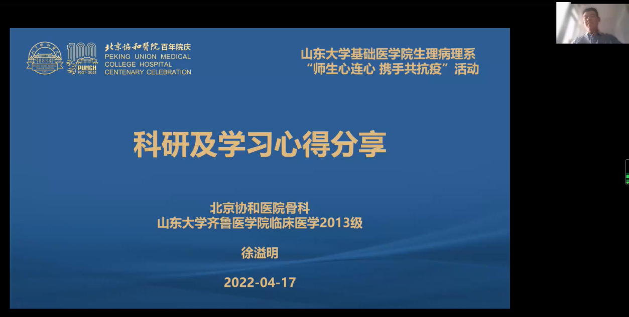 交流会上,党支部邀请到学院优秀毕业生徐溢明同学给大家介绍了自己从本科到专硕再到专博一路走来的学习经历与实验室经验,向同学们介绍了实验室里学习科研的经历,以及目前在北京协和医学院学习工作的情况。随后,李景新老师和崔敏老师向同学们讲述了当年带领本科生在生理实验室里进行科研训练的情况,并介绍了目前生理与病生学系实验室的现状,针对同学们提出的“进实验室对个人的要求”“实验室经历与未来临床方向的选择”以及“科研经历对于自身逻辑性的培养”等问题进行了详细而深刻的回答,讲述了科研经验对个人兴趣、逻辑性思维的培养的裨益,并指出参与科研训练的方式不仅仅局限于实验室,还有文献阅读、组会讨论、生物信息分析等多种提升科研水平的方式。
